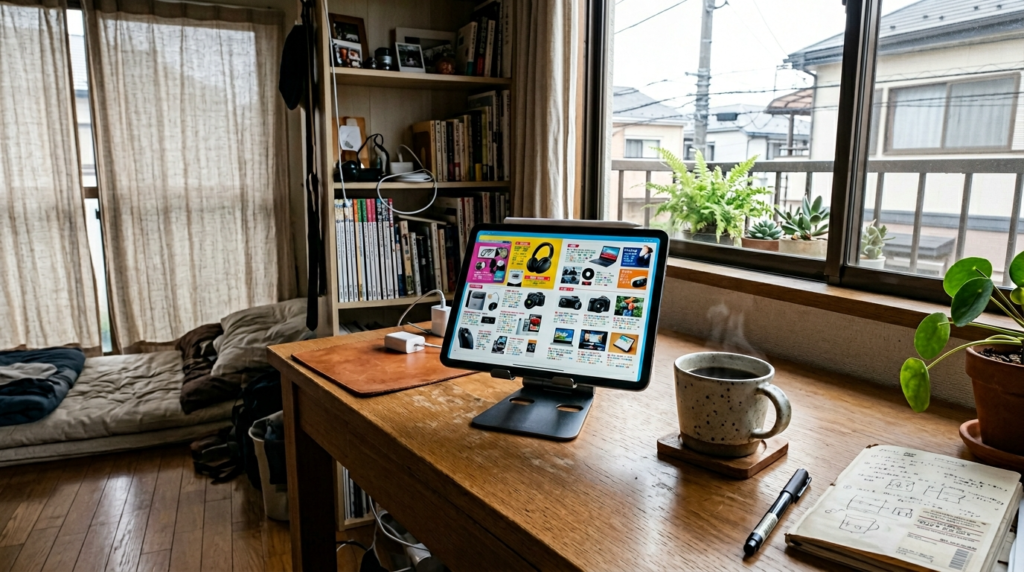 土曜の朝、10時くらいにのんびり起きてコーヒーを淹れる。デスクのタブレットスタンドにiPadを立てて、楽天マガジンかdマガジンを開く。まず『MONOQLO』の最新号でベストバイ特集をチェックし、次に『DIME』のガジェット特集を流し読み。気になるデバイスがあれば『Mac Fan』や『家電批評』でより詳しいレビューを探す。この一連の流れが月額572円で完結します。以前は本屋で立ち読みしていた時間が、自宅で座ったままコーヒー付きで再現できているわけです。